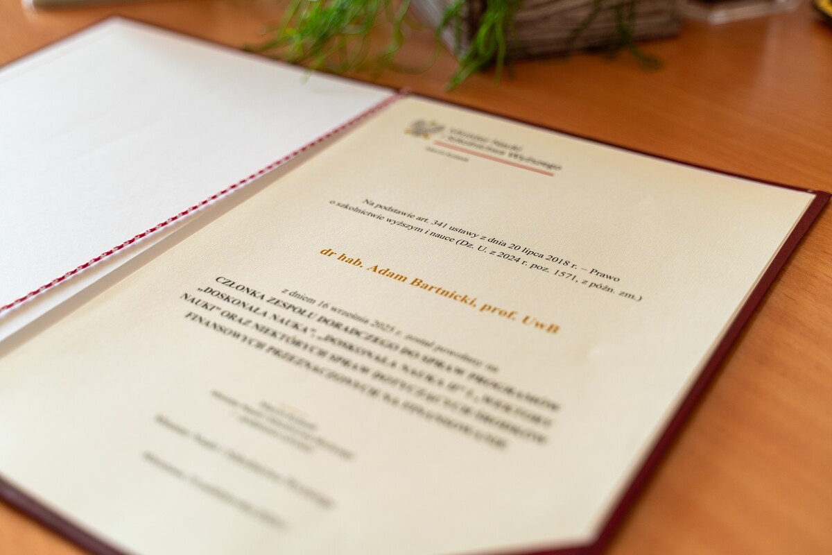 Ekspert z UwB otrzymał powołanie we wrześniu 2025 r., a decyzję podpisał minister nauki dr Marcin Kulasek. W czwartek, 6 listopada, prof. Adam Bartnicki odebrał nominację z rąk wiceministra nauki prof. Marka Gzika.