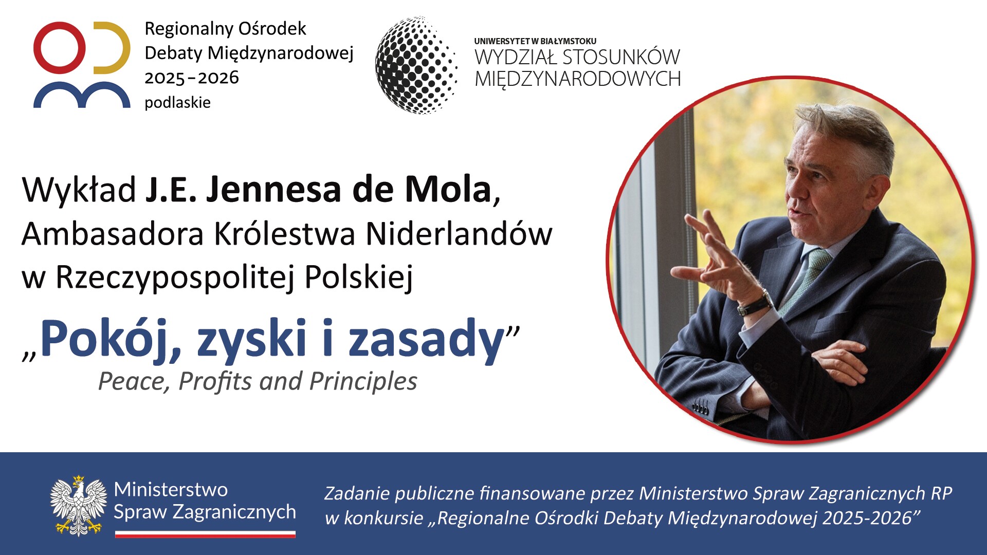 24 marca 2026 r. Uniwersytet w Białymstoku odwiedzi Jego Ekscelencja Jenness de Mol*, Ambasador Królestwa Niderlandów w Polsce. Wizyta odbędzie się na Wydziale Stosunków Międzynarodowych UwB w ramach współpracy z Regionalnym Ośrodkiem Debaty Międzynarodowej w woj. podlaskim.